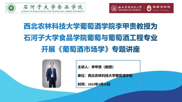4月10日清晨,石河子大学食品学院葡萄与葡萄酒工程2020级1-2班的同学们早早来到了教室,热切欢迎西北农林科技大学葡萄酒学院李甲贵教授走进课堂,作《葡萄酒市场学》专题讲座。