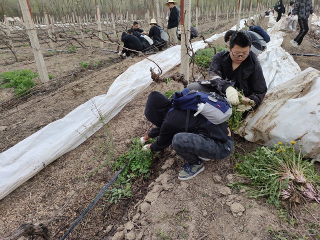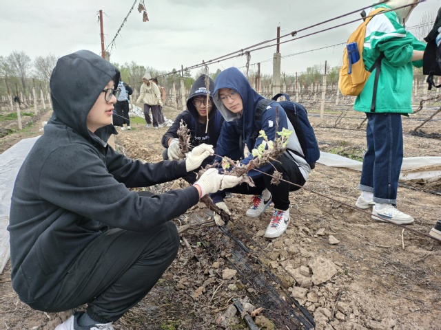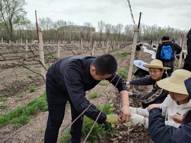 学院校外实习实践基地——张裕巴保男爵葡萄酒庄位于天山北麓酿酒葡萄产区,这里冬季寒冷、温度低,葡萄埋土防寒。随着春季气温回升,就到了葡萄出土的时候。此时学生们到来,实地学习苗木繁育、葡萄园建立等。