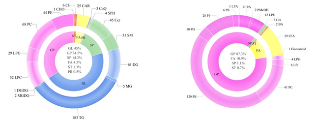 在本研究中,采用UPLC-MS/MS技术共检测836种蛋黄脂质分子,不同贮藏阶段的蛋黄脂质组成存在差异。在贮藏过程中,共鉴定出159种差异脂质。甘油磷脂代谢和甘油酯代谢是最关键的代谢途径,PA、LPA和DG被认为是贮藏过程中最重要的脂质代谢产物。通过KEGG通路分析贮藏蛋黄中的差异脂质,可以拓宽对贮藏过程中蛋黄脂质变化及功能的认识和鉴定。本研究发现的不同脂质种类可作为评价鸡蛋贮藏过程中潜在品质标志物。