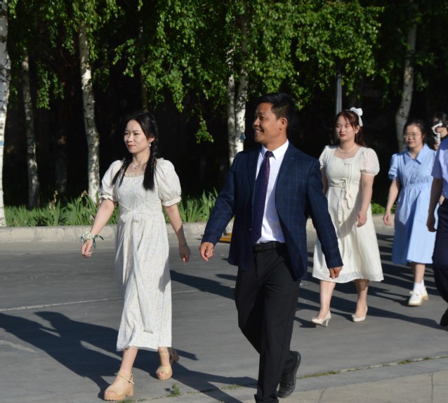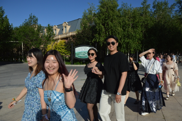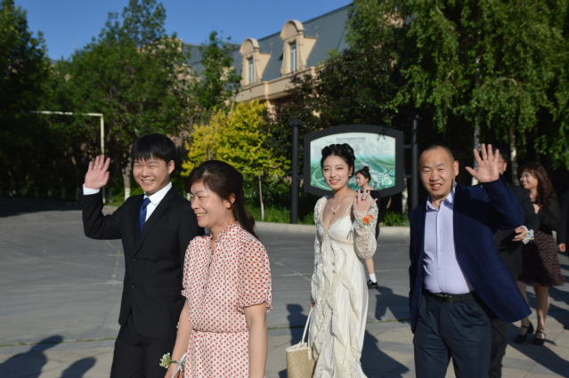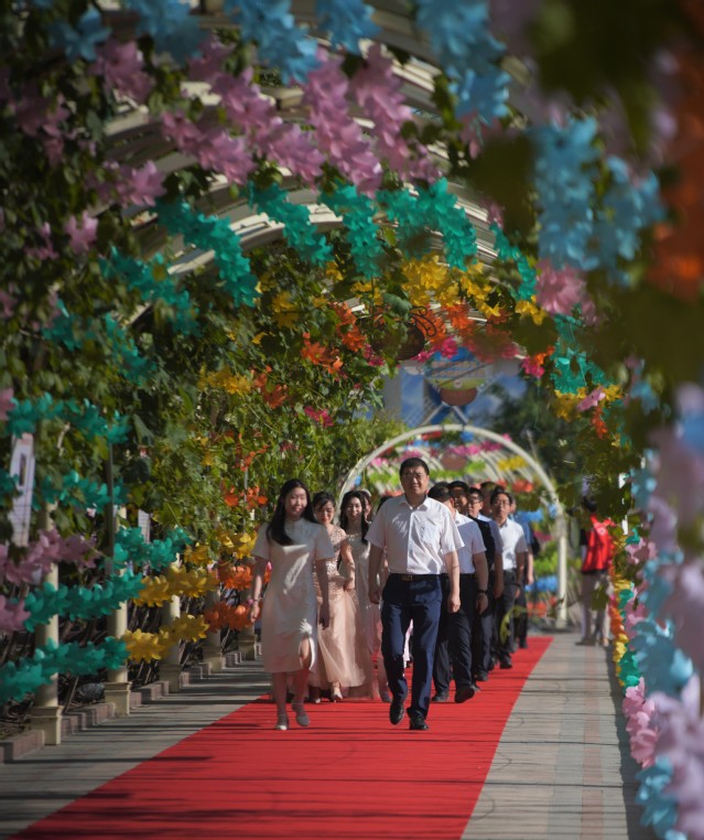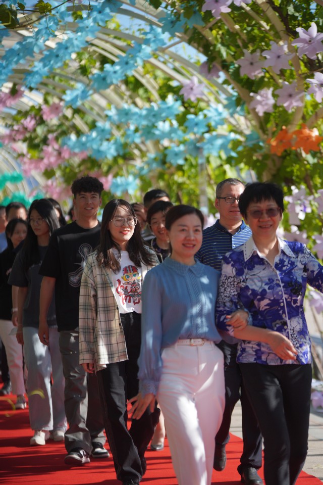 伴着悠扬的歌声,结对师生亲戚、毕业生们身着盛装,佩戴鲜花手环,款款走上红毯,展示着青春洋溢的步伐、活泼可爱的动作、阳光明媚的笑容。