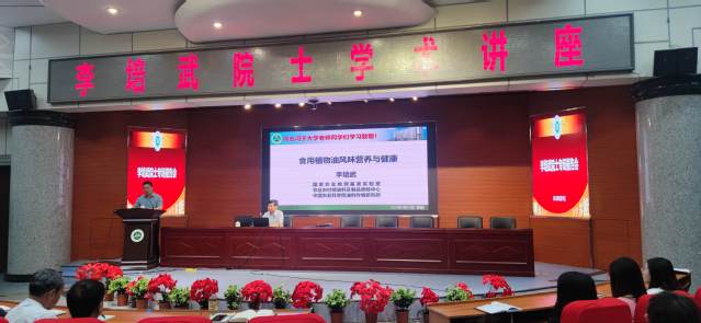 6月19日,中国工程院院士、中国农业科学院油料作物研究所研究员、博士生导师李培武,应邀为我校师生作题为:“食用植物油风味营养与健康”专题讲座。食品学院院长张建主持,大学科研处处长吴大勇、食品学院和机械电气工程学院全体院领导和师生代表300余人参加。