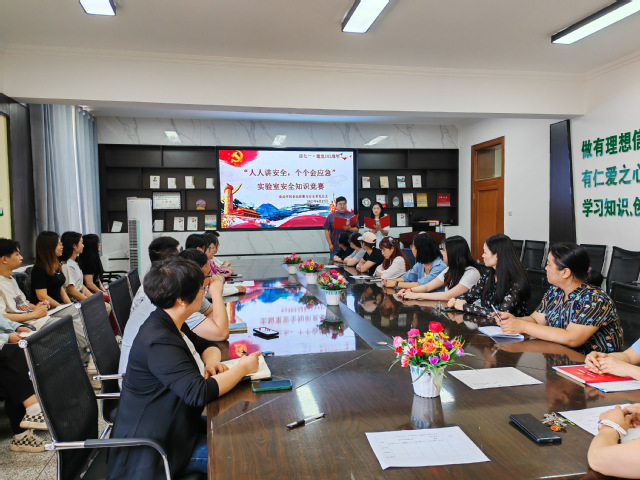 为迎接“七一”党的生日,庆祝中国共产党成立102周年,学习贯彻落实习近平总书记关于安全生产的重要论述和重要指示批示精神,加强实验室安全知识普及,提高学生安全防范意识和自我保护能力,6月27日,食品质量与安全系党总支举办“人人讲安全 个个会应急”实验室安全知识竞赛,食品质量与安全系全体师生参加,学院实验中心周红老师和刘文玉老师担任评委。