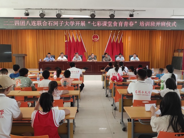 7月12日上午,同学们参加十四师昆玉“七彩课堂,食育青春”开班仪式。现场,十四师昆玉市党委书记蒋欣对实践团的到来表示热烈欢迎,希望实践团成员能够在这15天课程培训中积累经验、有所收获,让“七彩课堂”真正走进团场,为团场的孩子们带来一个安全、充实、快乐且难忘的“七彩假期”。