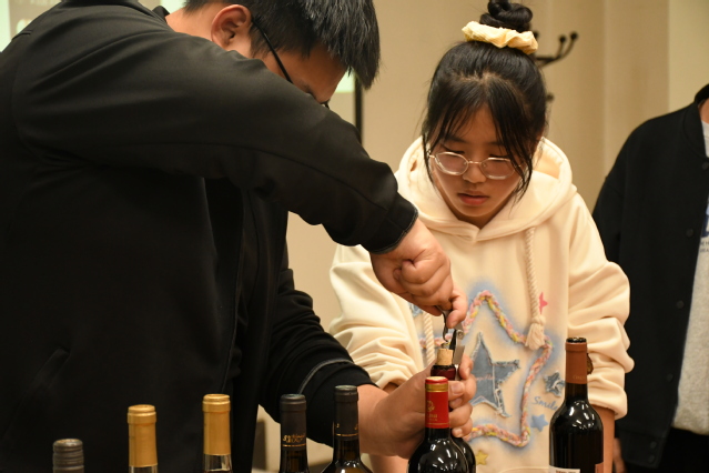张会佳首先分享了葡萄酒酒杯、酒瓶、醒酒器和海马刀等酒具的类型及其使用范围。接着讲解了葡萄酒的基本礼仪,如持杯、摇杯、碰杯、开酒、醒酒、倒酒等。同学们积极学习,现场练习,整个活动氛围和睦活跃。