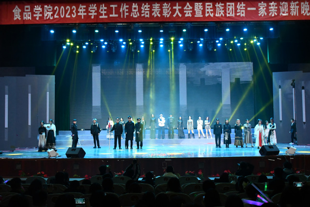 千帆竞发启新程,逐梦山海赴“食”光。12月3日下午,食品学院在北区大会堂顺利举办2023年学生工作表彰总结大会暨民族团结一家亲迎新晚会。学院党委副书记雷建鹏主持大会,石河子大学学工部部长、学生处处长王虎挺、学院党委书记程卫东、学院副院长魏长庆,各系负责人及全院师生共同参加了本次大会。