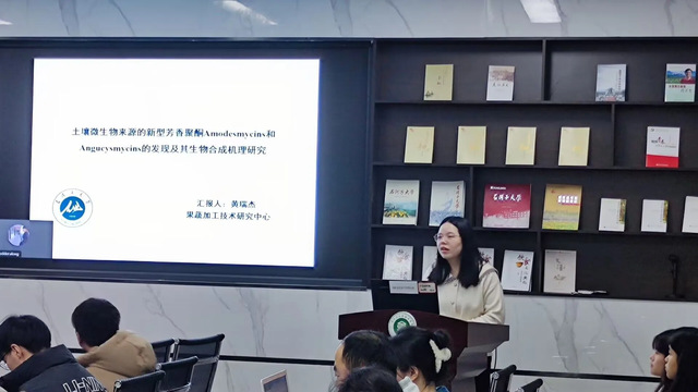 交流会上,新进教师黄瑞杰以《土壤微生物来源的新型芳香聚酮Amodesmycins和Angucysmycins的发现与生物合成机理研究》为主题进行了交流,生动的讲解了利用宏基因组技术从环境中获得大量非培养微生物的天然产物生物合成基因资源,推测产物的生物合成过程;