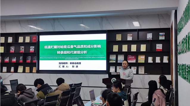 优秀研究生彭波以《低温贮藏对哈密瓜香气品质和成分的影响:转录组和代谢组分析》为主题进行汇报,讲解了低温贮藏对哈密瓜香气物质的组成与含量的影响,并阐述了哈密瓜采后储存过程中与香气合成相关的生物合成途径;