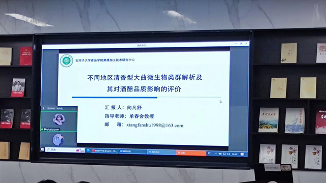 优秀研究生向凡舒以《不同地区清香型大曲微生物类群及其对酒醅品质影响的研究》为题展开详细的汇报,通过高通量测序技术对清香型大曲微生物类群的比较分析,并讲解了利用分子生物学手段对微生物菌株进行分离、鉴定和保藏,揭示酒曲和酒醅微生物类群对酒醅品质的影响。