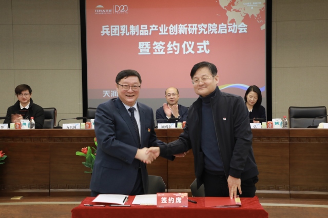 2月23日,兵团乳制品产业创新研究院在新疆天润乳业股份有限公司正式揭牌成立,依托天润生物科技有限公司,与石河子大学、新疆大学、中国农业科学院、北京中医药大学等单位携手共建。兵团工业和信息化局党组成员、副局长顾成奎,兵团科学技术局党组成员、副局长李弘出席揭牌仪式。中国工程院院士任发政、农业农村部食物与营养发展研究所所长王加启、国际食品科学院院士王强线上参加。食品学院倪永清教授作为特邀专家参与研究院启动会签约仪式,并与天润乳业党委书记、董事长刘让签署了研究院共建协议。