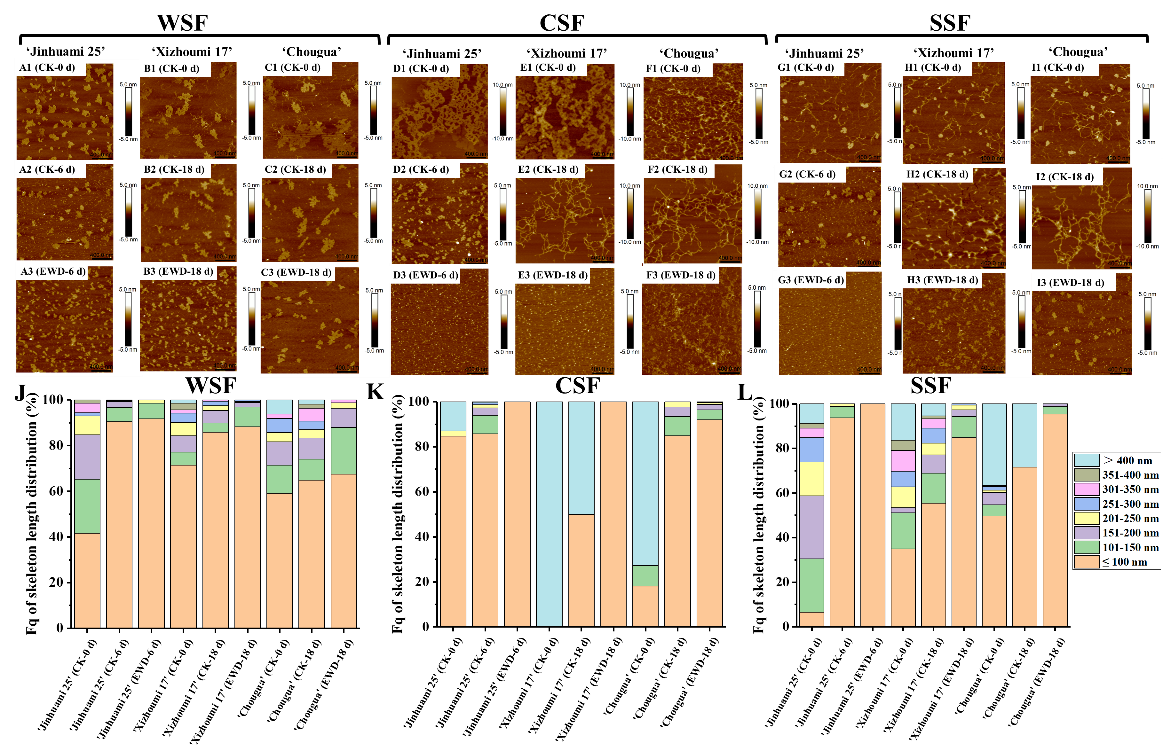 果实宏观质地和感官品质的变化与其微纳米结构的改变有关。在微观层面上,细胞壁多糖的解聚和细胞壁结构完整性的破坏是导致果实薄壁组织质地变软的关键因素,细胞壁在决定果实质地方面起着重要作用。细胞壁包含多种多糖成分,如果胶、纤维素和半纤维素。其中果胶是一种以半乳糖醛酸为主的复杂结构聚合物,天然存在于初代细胞壁(以均半乳糖醛酸(HG)、鼠李糖半乳糖醛酸I(RG-I)和鼠李糖半乳糖醛酸II(RG-II)三种形式存在)和中间片层中,有助于增强细胞间黏附和细胞的机械强度,也被认为是影响果实质地的关键成分。然而,简单定量和定性果胶生化过程很难与物性质地改变联系起来。为了更好地理解蜡质损伤加速哈密瓜软化过程中果胶结构与果实质地之间的相互关系,需要对果胶多糖分子进行更深入的分析。在这种情况下,AFM是一种有效的手段分析表征复杂样品在自然状态下分子水平上变化,它可提供生物分子如DNA、蛋白质和包括果胶在内的多糖表面形貌的三维图像,它具有用最少的样品研究材料和多糖构象的优势,可实现对单个游离果胶分子的观察,便于确定单个果胶分子长度和宽度分布情况。研究发现利用AFM观察到黄桃中离子结合型果胶分子的链宽和分支度随着果实的软化逐渐减小;其中果胶的降解发生在主链和侧链上,且通过AFM的精确计算和观察发现果胶链由四个基本单元组成,宽度分别为11.719、15.625、19.531和17.578 nm。然而目前尚未采用AFM技术分析采后表皮蜡质损伤对哈密瓜软化过程中果胶多糖纳米结构的影响。
