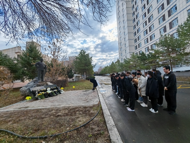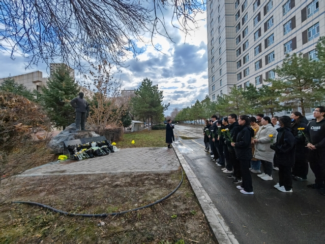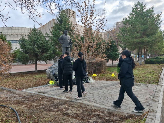 在张仲瀚将军雕像前,全体党员同志依次上前敬献鲜花并满怀深情和敬意地向雕像致鞠躬礼,默哀一分钟。随后,党支部书记褚宇欣带领大家回顾了张仲瀚将军的英雄故事,并表达了对先烈的崇高敬意和深切缅怀。她强调:“张仲瀚将军将他对祖国的热爱及三十余年的热血洒在了这片热土,他用毕生的精力在大漠荒原建造了绿洲学校,历史忘不了,石大人忘不了,兵团人忘不了,人民也忘不了,如今他的雕像屹立在石河子大学校园,陪伴着一代又一代的师与生,守望着一年又一年的教与学,我们应当始终牢记兵团人的使命与责任,将爱国之心、报国之志,效国之行、强国之情付诸于实际行动当中,传承红色基因,与祖国、兵团、母校同呼吸共命运,不忘初心谨记来时路,砥砺前行谱写新篇章。”