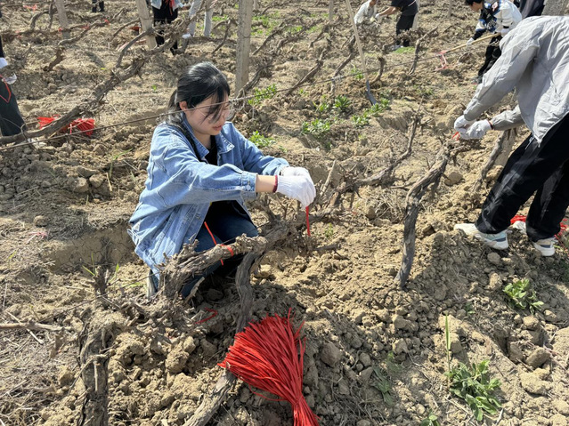 为更好的组织本次实习,中信尼雅酒业葡萄种植公司总经理李树德、园艺师李兆寰来到田间,为同学们讲解了该产区埋土防寒种植要点。薛波老师、李兆寰园艺师为同学们示范了葡萄出土、上架、绑蔓、清沟等操作。同学们3人一组,手拿绑绳、互相协作,将葡萄藤曼绑缚到架面第一道铁丝上,看着上架的葡萄藤,同学们都露出了欣慰的笑容。完成了一个种植小区的葡萄出土工作。同学们积极上手实践、领悟操作要点,将书本知识具体化。