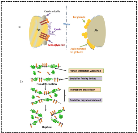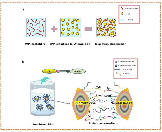 同样,在油水体系中同时加入乳化剂和蛋白质,二者在乳状液中的相互作用也是多方面的,不仅相互结合,而且相互竞争,结合形式也多种多样,有以静电相互作用的静电结合、以氢键相互作用的氢键结合,与疏水键相互作用的疏水结合等,都能够在一定程度上影响乳状液的稳定性。另外,乳化剂和蛋白质可以形成具有不同界面活性的蛋白质-表面活性剂复合物,这通常取决于蛋白质和乳化剂的性质,包括蛋白质的类型(例如球状或无规则卷曲)和表面活性剂(例如离子或非离子)以及表面活性剂的使用浓度(低于或高于临界胶束浓度)。还有研究发现,乳状液从由蛋白质稳定转变成主要由乳化剂稳定主要通过两个步骤,首先乳化剂与蛋白质分子相结合,其次,乳化剂吸附到界面上与蛋白质分子竞争界面区域,最后将蛋白质分子从界面上解吸下来。