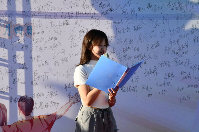 2020级辅导员胡建军老师宣读《致四年后的自己的一封信》。“见字如面,展信舒颜,在大学开端执笔写下的第一封书信,一字一句都是真情的投入,千言万语皆是青春的风采。亲爱的毕业生们,你是否一如四年前期待的一般,一本初衷,履践致远?”