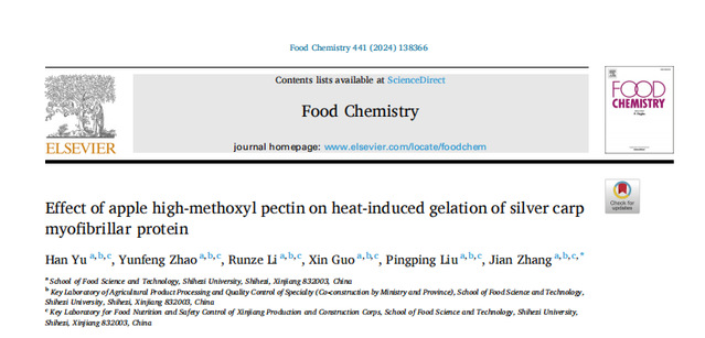 我们以苹果高甲氧基果胶(HMP)为原材料,研究对热诱导鲢鱼肌原纤维蛋白(MP)凝胶化的影响。研究HMP在热诱导凝胶形成之前对MP中活性巯基(-SH)含量变化和相互作用时热力学变化;在凝胶形成过程中储能模量(G’)的变化;在凝胶形成后对水分分布、表面疏水性、微观结构、作用力分析、光谱分析、凝胶强度和热稳定性等的影响,推测MP和HMP相互作用的潜在机制。