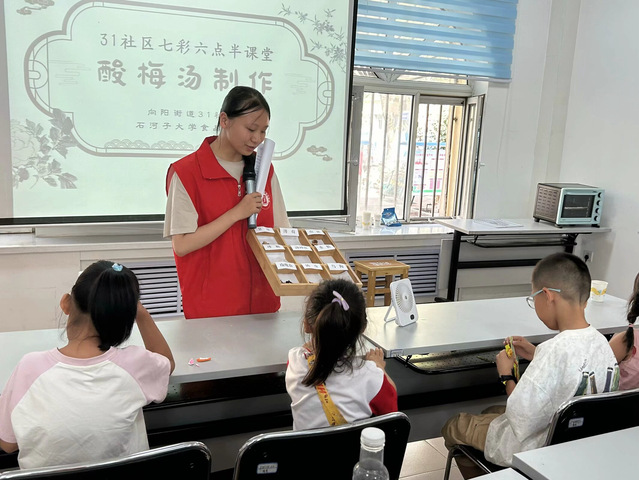 酸梅汤是传统夏季饮品之一,也是药食同源的经典汤剂。食品学院“七彩红柳”实践团依托社区“七彩六点半”课堂,开办“知·食”营养健康讲堂、“食·趣”夏令营、“食·研”营养状况调研等专题活动,助力社区青少年树立践行“大食物观”,度过七彩假期。