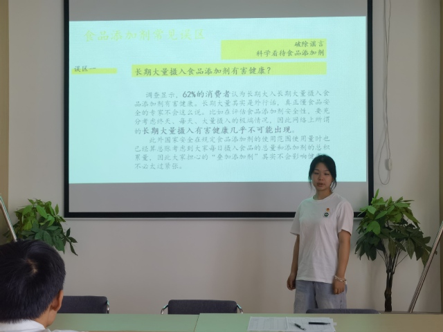 实践团成员阮森茹为青少年学生们详细讲解了如何预防食物中毒、如何做到正确健康饮食等关键知识要点。她特别强调了无生产日期、保质期及生产厂家的“三无”食品的危害性。团队成员还通过播放小视频、PPT展示等形式,进一步向社区居民普及了食品安全相关知识,积极引导了青少年们养成健康的饮食习惯,避免购买“三无食品”。