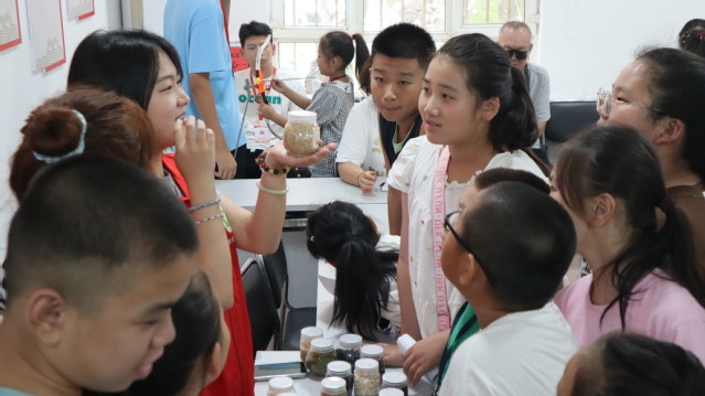 “这是红豆!”“这是花生!”“这是黄豆,不对,是绿豆……”参与游戏的小朋友们正辨认着盒子里的粮食,并将对应的谷物放在相应的名字罐中。实践团成员事先准备好了20种不同的豆子混合好放入盒子中,小朋友们将辨认出来的豆子放入对应名字的罐子内,参加的小朋友获得一个印章“麦”。实践团成员温雁和任舒畅在检查正误的过程中给小朋友们讲述每种粮食不同的来历和性质,帮助小朋友们进一步认识粮食。