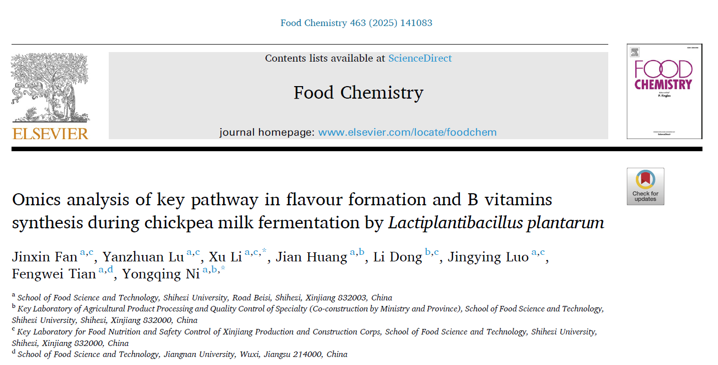 近日,食品学院倪永清教授团队在益生菌发酵鹰嘴豆奶相关机制研究中取得新进展,研究结果以“Omics analysis of key pathway in flavour formation and B vitamins synthesis during chickpea milk fermentation by Lactiplantibacillus plantarum”(植物乳杆菌发酵鹰嘴豆奶风味形成和B族维生素合成关键途径的组学分析)发表于食品领域TOP期刊《Food Chemistry》(中科院1区TOP,IF:8.4997)。