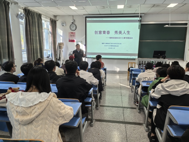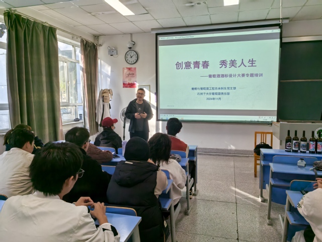 为提升学生的美学修养和葡萄酒文化知识,激发学生的创造性思维和学习兴趣,加强学生的实践能力,2024年10月19日,石河子大学北区绿三101阶梯教室,来自全校18个学院的72个专业的400名余同学齐聚一堂,通过线上线下方式聆听了酒标设计专题培训,标志着石河子大学“张裕杯”第二届葡萄酒酒标设计大赛正式启动。