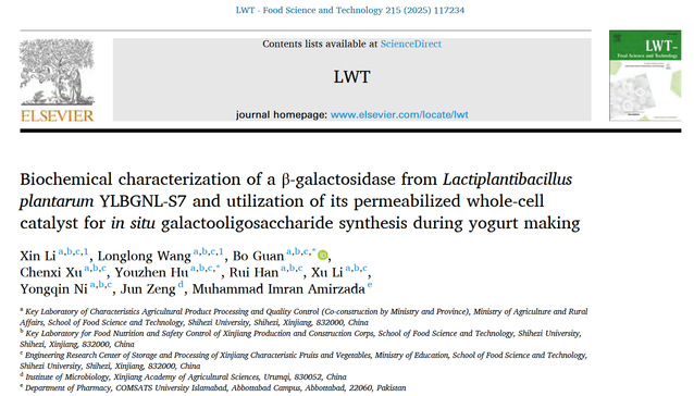 近日,食品学院关波教授、胡有贞副教授指导研究生在LWT-Food science and technology(中科院一区Top,IF=6.0)发表了题为 Biochemical Characterization of a β-Galactosidase from Lactiplantibacillus plantarum YLBGNL-S7 and Utilization of its Permeabilized Whole-cell Catalyst for in situ Galactooligosaccharide Synthesis during Yogurt Making植物乳植杆菌YLBGNL-S7 β-半乳糖苷酶的生化特性及其透性化全细胞催化剂在酸乳制备过程中原位合成低聚半乳糖的应用的原创性研究论文。