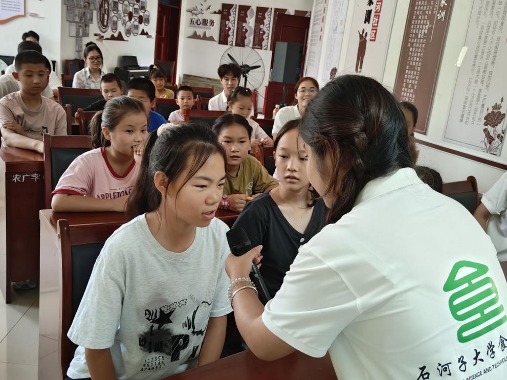 “接下来,我们玩个游戏!”实践团成员金秀丽敲响手中的小鼓,彩花随之在孩子们手中传递。鼓声骤停,接到花的小朋友立刻站起,有模有样地复述魏德友爷爷巡边的故事;“传声筒”环节里,孩子们依次传递“艰苦创业”“无私奉献”等关键词,虽是简单的互动游戏,却也让兵团精神的内核悄然扎根。
