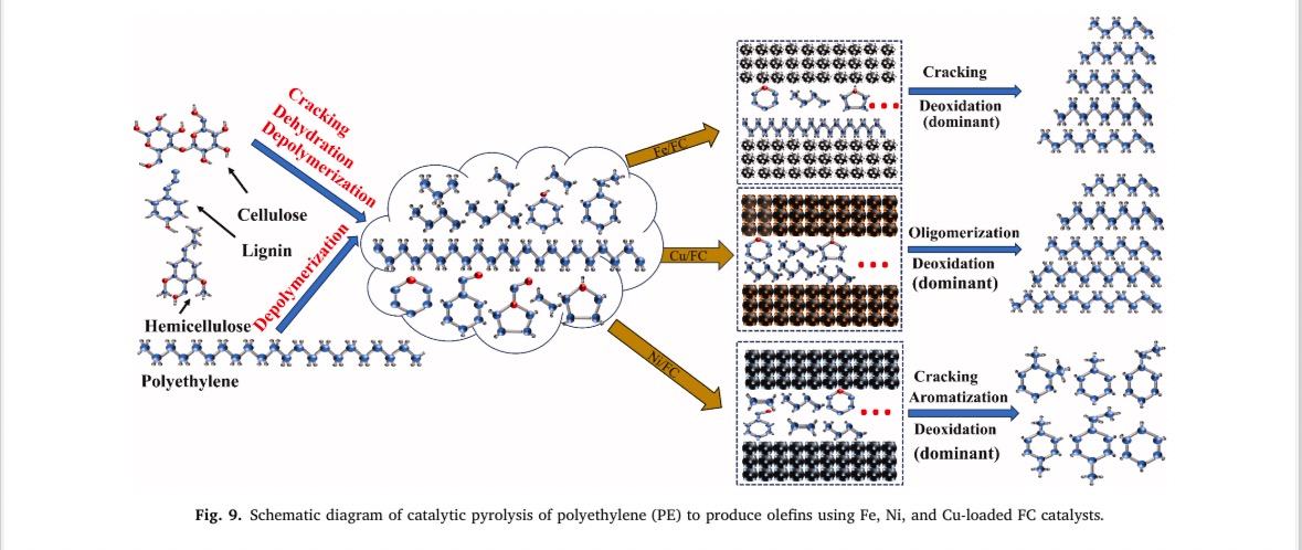本研究为地膜塑料(GFP)等固体废弃物的资源化利用提供了新思路。以地膜塑料(GFP)和棉花秸秆(CS)为原料,通过微波辅助共热解制备生物油。基于生物油成分变化,重点探讨了负载不同过渡金属(FeCuNi)的鱼骨基催化剂(FC)对GFPCS共热解所得生物油中烯烃和芳烃组成的影响。结果表明:使用20Fe/FC催化剂时,Fe活性位点选择性结合反应物促进裂解,主导催化裂化与脱氧过程,有效促进键断裂,显著提升轻质烯烃产率与品质。使用10Cu/FC催化剂时,Cu位点增强催化活性及低聚化能力,需较高热解温度以实现更广泛的键裂解及后续碳聚合;该催化剂同时促进Diels-Alder反应,提高单环芳烃产率并改善生物油品质,但易通过裂解聚乙烯(PE)双键引发聚合反应,生成长链烃类。使用10Ni/FC催化剂时,Ni位点在裂解、芳构化及脱氧反应中均表现出优异活性;小分子烯烃、含氧化合物及来自CS/GFP的氢自由基可进入Ni活性中心,实现脱氧和Diels-Alder反应;该催化剂能高选择性生成单环芳烃,并在烃类裂解过程中促进氢转移,有效提高轻烃收率并提升生物油品质。本研究为鱼骨、地膜塑料(GFP)及生物质(棉花秸秆CS)的资源化利用提供了科学依据,对解决环境污染问题具有重要意义。