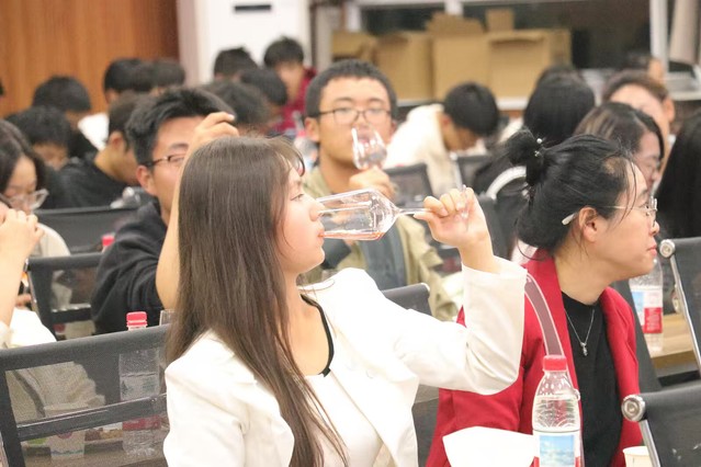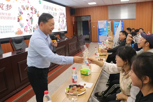品鉴会,葡萄与葡萄酒工程系王平教授结合新疆葡萄酒特色、色泽、香气和口感特点,带领在场师生科学品鉴多款葡萄酒。同时,现场还准备了食品学院学生手工制作的中秋月饼,结对师生在美酒与美食中感受文化交融魅力。在趣味问答环节,主持人就葡萄酒文化、中秋节传统文化、新疆风土人情等主题发起抢答。结对师生并肩作答,掌声、欢呼声此起彼伏。“葡萄美酒夜光杯”,千古名句绘盛景。活动最后,全体结对师生共同举杯,齐声朗诵唐代诗人王翰的《凉州词》。活动现场,各民族文化交流交融,共庆华诞豪情激荡。