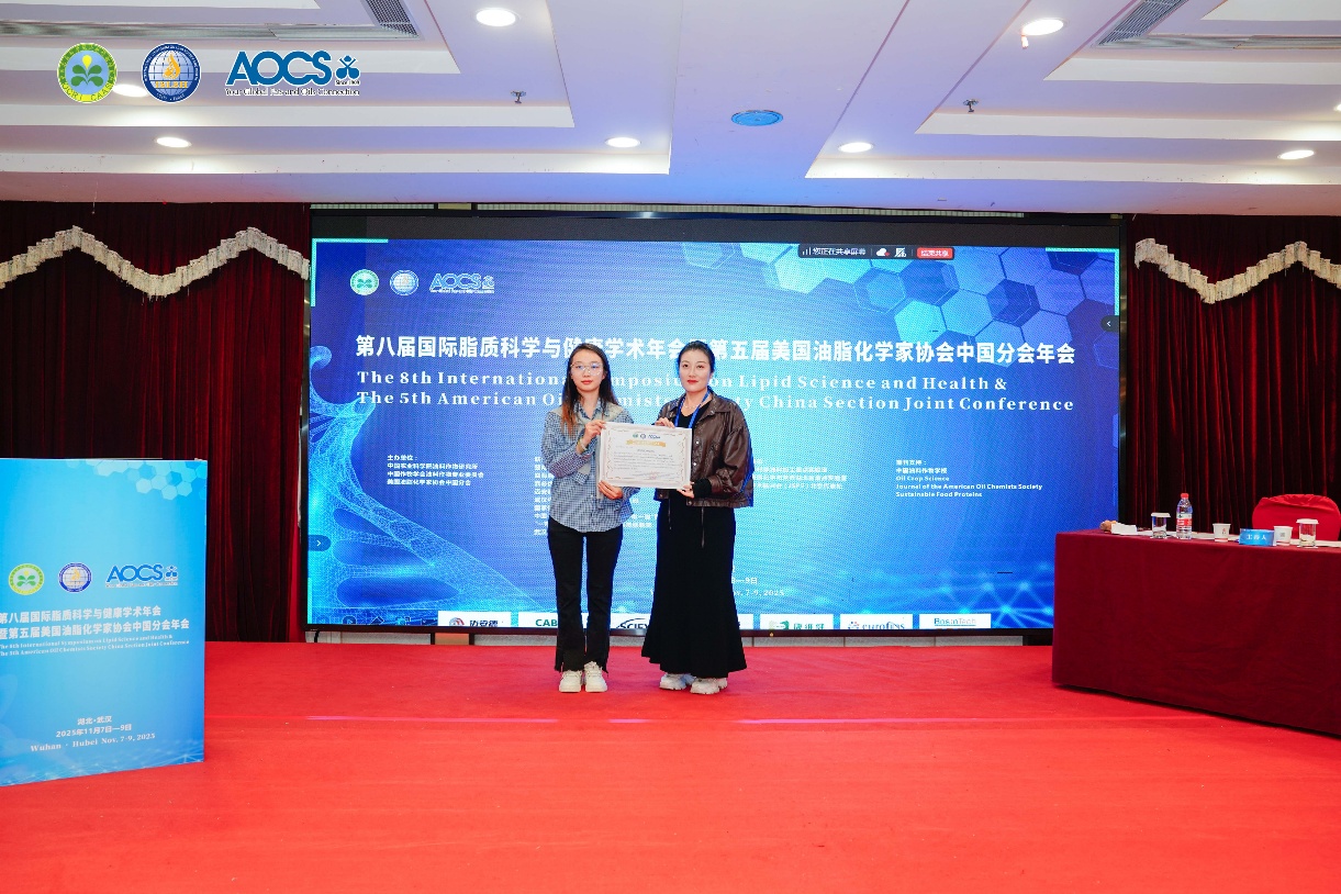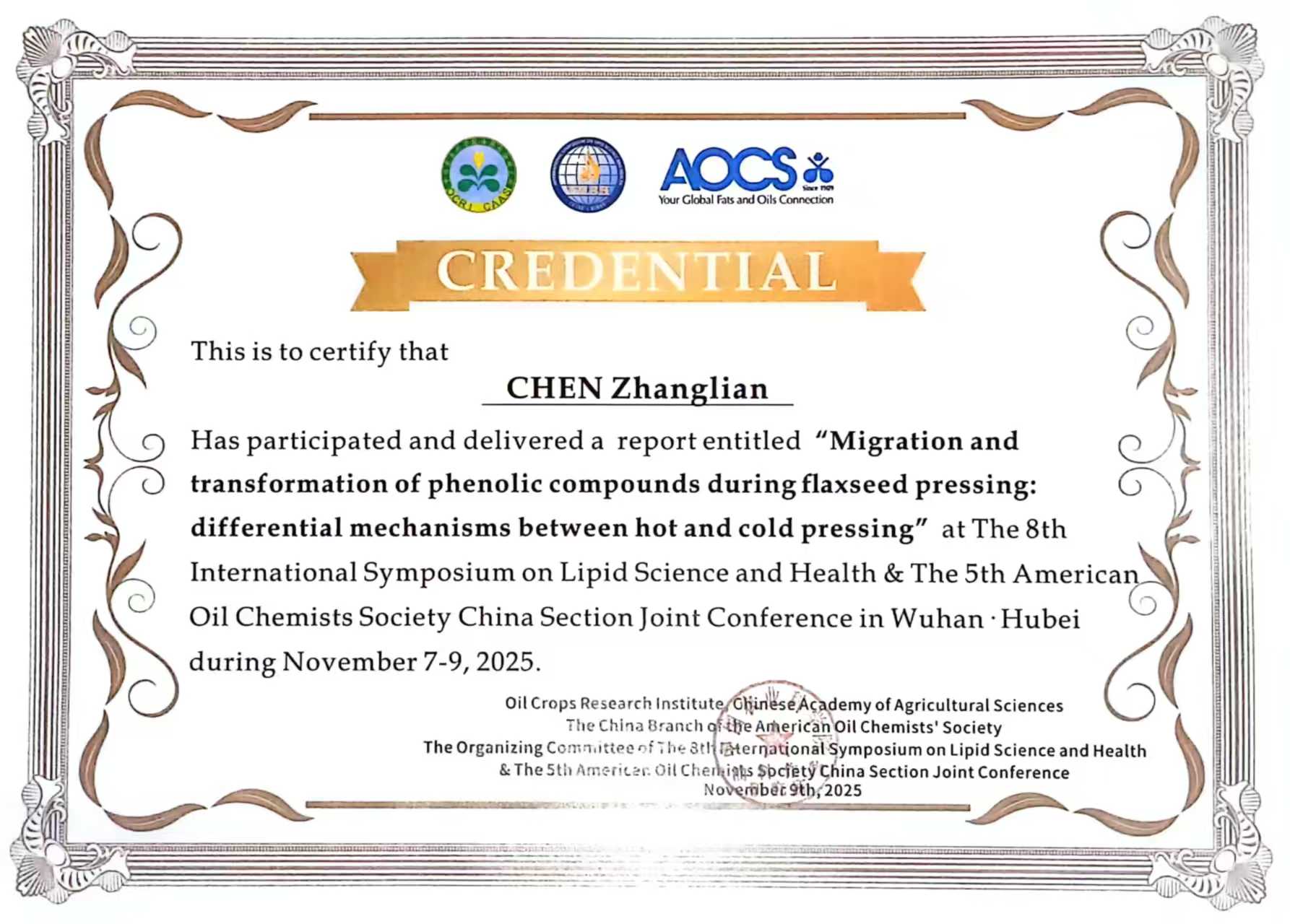 2025年11月7日至9日在湖北武汉召开“第八届国际脂质科学与健康学术年会暨第五届美国油脂化学家协会中国分会年会”,此次会议由中国农科院油料作物研究所联合美国油脂化学家协会中国分会等单位联合主办。作为脂质科学领域极具影响力的国际学术交流平台,本次会议以“新质生产力赋能脂质 & 蛋白质产业可持续发展”为主题,汇聚了全球16个国家的知名专家学者、行业精英及青年科研人员,共同探讨脂质科学与健康领域的前沿进展与产业趋势。石河子大学食品学院粮油技术研究中心硕士研究生陈章莲参会,并在研究生论坛作题为《亚麻籽压榨过程酚类化合物的迁移与转化:热榨与冷榨的差异机制》专题学术报告,系统分享了团队在亚麻籽加工过程中功能成分转化机制方面的最新研究成果,引发与会专家广泛关注。
