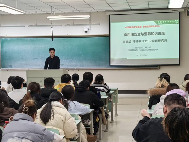 为深化产教融合,助力学生贯通理论与实务,12月10日,新疆农垦科学院王楠斌副研究员受邀走进《食品质量管理与控制》课堂,围绕“食用油的安全与营养”主题,为同学们带来了一场干货满满、贴近行业的专业讲座。
